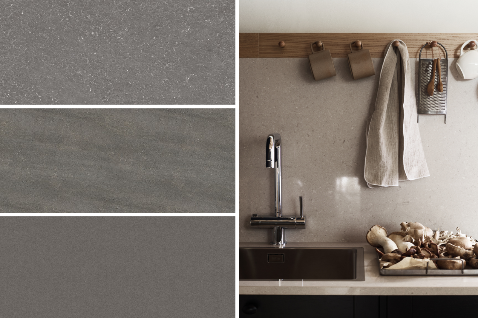 Uusi laminaattitasovalikoima tuo keittiöihin rauhallisuutta, lämpöä ja luonnollista rytmiä. Materiaalien innoittajina toimivat kivi, betoni ja kalkkikivi, joiden pinnat tuovat tilaan hienovaraista elävyyttä ja aitoa tuntumaa ilman liiallista kuviointia.