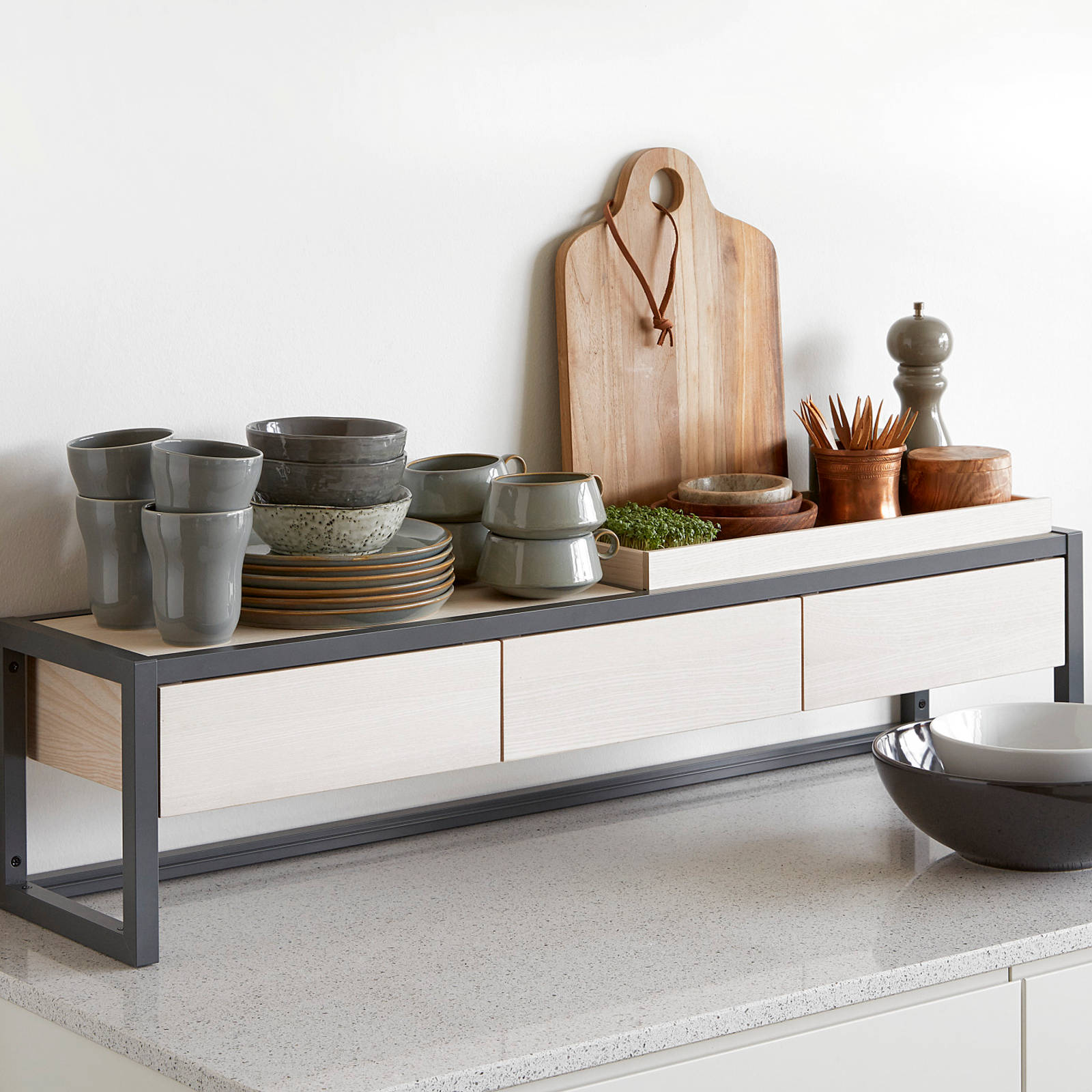 Sähköisesti nousevalla ja laskevalla kulmamekanismilla saat kodinkoneet tai muut keittiön tavarat helposti piiloon ja esille.